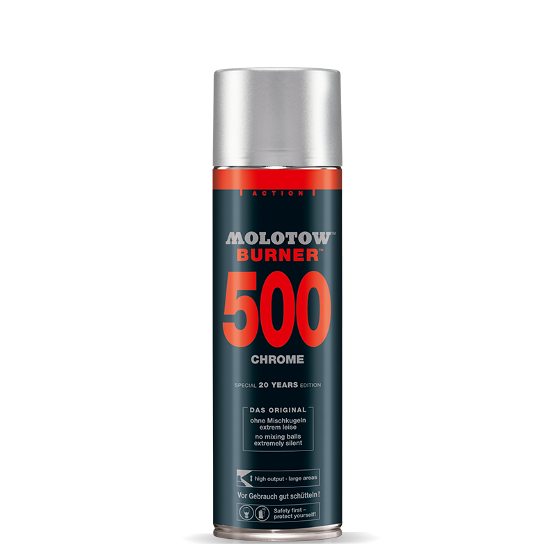 BURNER™ Chrome ja Black on ideaalsed töövahendid kiireteks töödeks. Kuni tänase päevani on BURNER™ Chromei kvaliteet oma kategooria absoluutne tipp. Väga kõrge pigmendi tase tagab värvi laitmatu katvuse. See action värv ei anna järgi milleski: tänu kõrgele rõhule saavad suured pinnad kaetud väga kiirelt. Samuti on värvipurk vaikne kuna pigment ei vaja segamiseks kuule. Patenteeritud Molotow™ tehnoloogia garanteerib töökindluse isegi -10C juures.