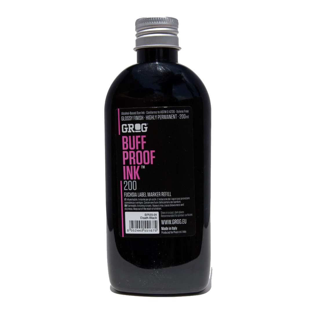 BUFF PROOF INK(Eemalduskindel tint) on Grogi kõige esimene toode. Alkoholi baasil kaua püsiv tint töötati välja squeezeritele kuid sobib ideaalselt ka CUTTER markerite täitmiseks tänu heale viskoossuse ja voolavuse tasakaalule. Ideaalne sisetingimustes kasutamiseks ning sobib nii poorsetele- kui ka mittepoorsetele pindadele