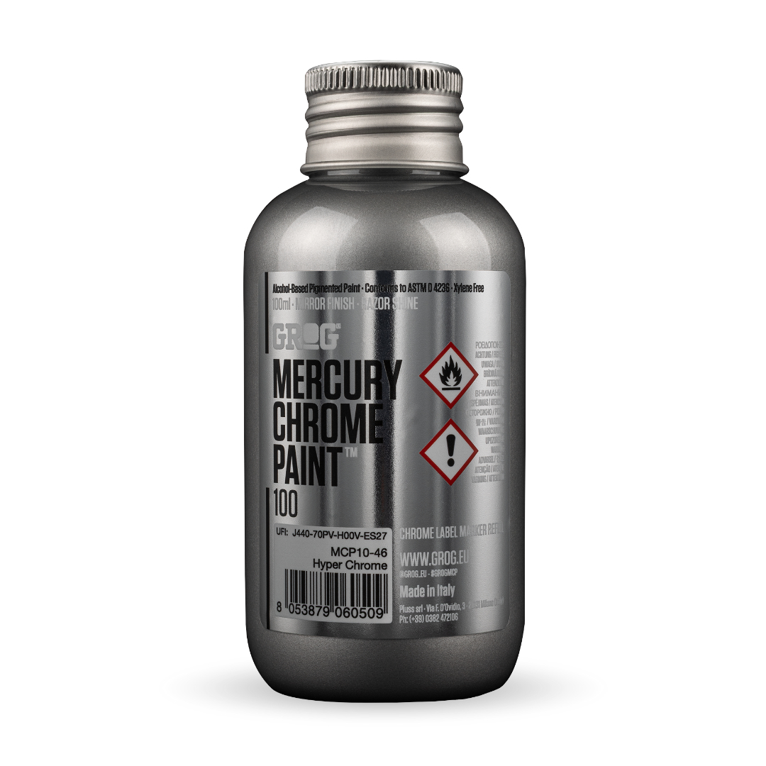 MERCURY CHROME PAINT™ 100 on GROG Chrome Label markeritele mõeldud 100 ml täitematerjal, mis viib kroomhõbedase värviga selle peegeldusvõime piirini. See löögikindlas plastpudelis olev alkoholipõhine metallivärv annab julge, peegelpildilise viimistluse ja veatu voolavuse – ideaalne CUTTER, POINTER ja SQUEEZER markeritega märgistamiseks. Mida libedam on pind, seda intensiivsem on peegliefekt. Puhas särav rahulolu.